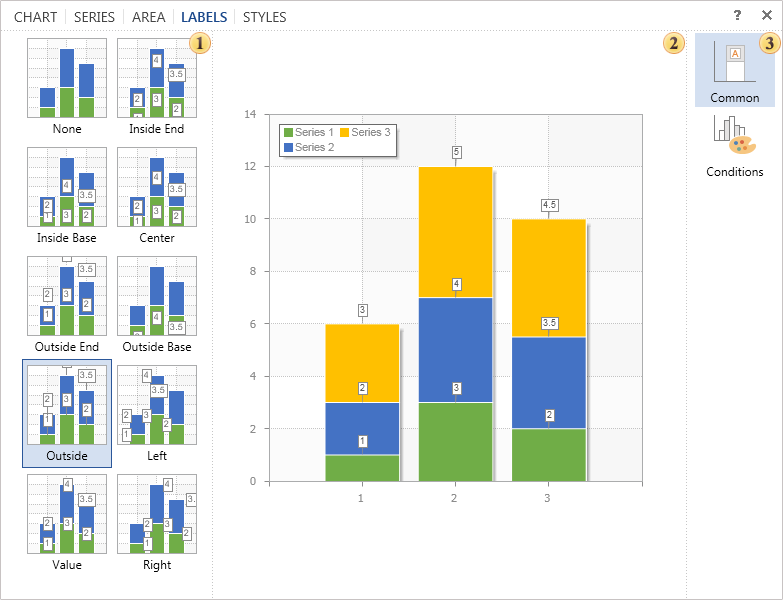 • If the mode Show Series Labels: From Chart is enabled then the type of series labels will be the same as selected in the tab Labels. For example, you have a chart with 10 series in it and labels should have the same style, which means the same type. In this case, on the tab Labels, you can define the type and in settings of each series you can specify the mode Labels From Chart.