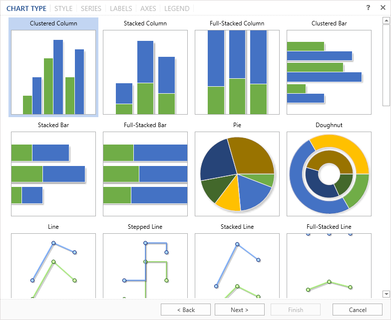 The Chart wizard provides an opportunity to create a chart in a few simple steps. To start the wizard, you should the button Chart Wizard in the chart editor. The wizard provides a step-by-step procedure to create a chart. By default, the first type (Clustered Column) is selected in the list.