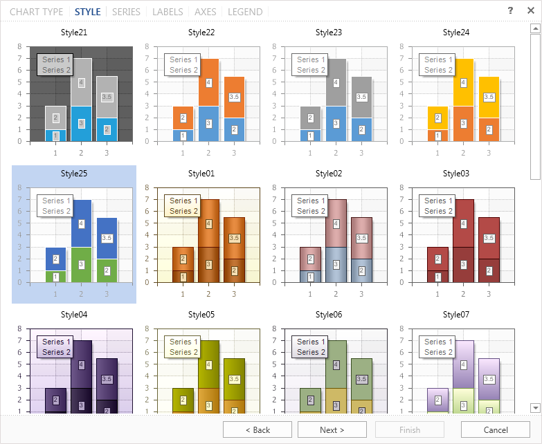 The chart component contains a collection of preset styles for the chart. Select one of them to create a chart. By default, the first style in the list is selected.