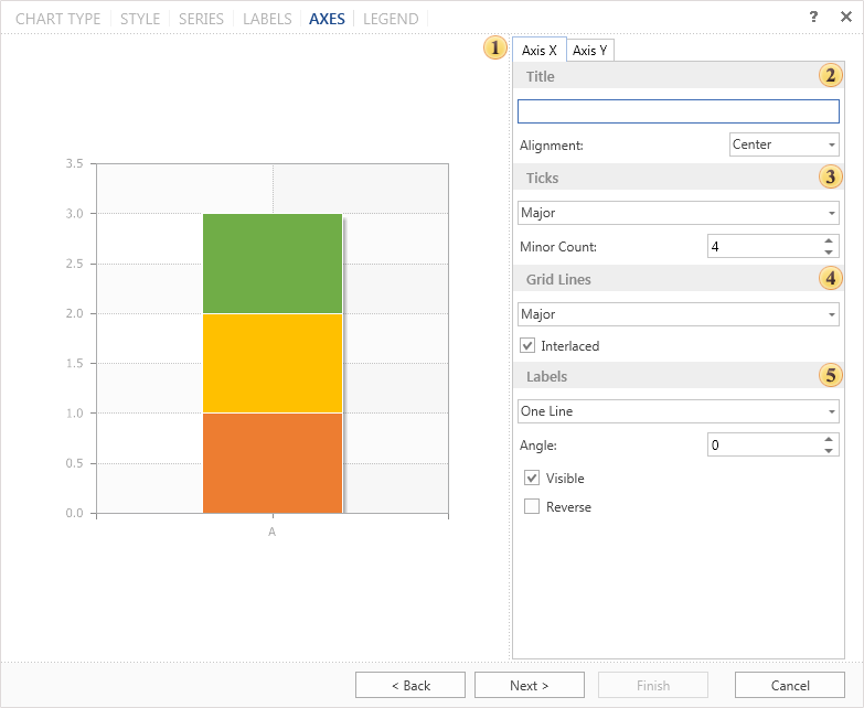 The group Labels. In this group you can specify the parameters of axis titles such as on/off, reverse, etc.