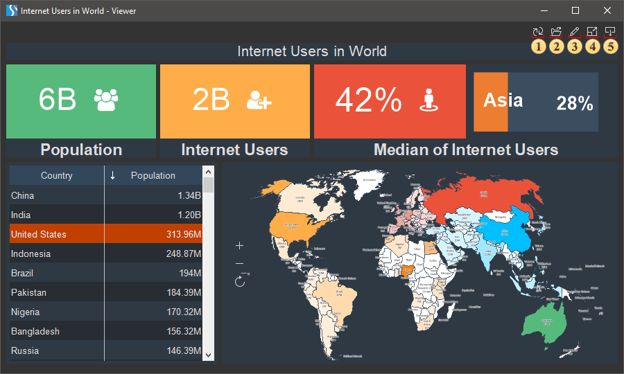The Full Screen button is used to view the dashboard in the full-screen mode. To exit this mode, you can use the Esc or Alt+F4 hot keys.