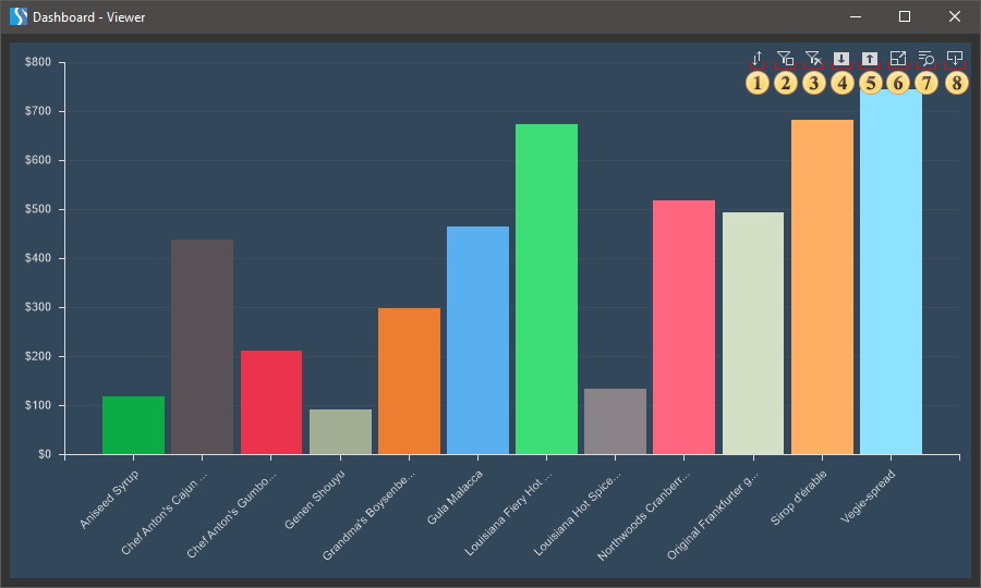 You should know that you can enable or disable displaying of the Sort, Save, View Data and Full Screen buttons in the viewer or on the preview tab. Select the element in the report designer, click the Interaction button on the Home tab of the Ribbon panel, and enable (or disable) the check box for the parameters if you want to display (or not display) the buttons of the element.