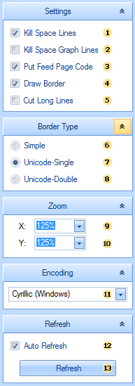 By default, Zoom X = 100%, Zoom Y = 100%. With these values of the parameter, the A4 page is converted to text with sizes of 80 characters by width and 62 rows by height.