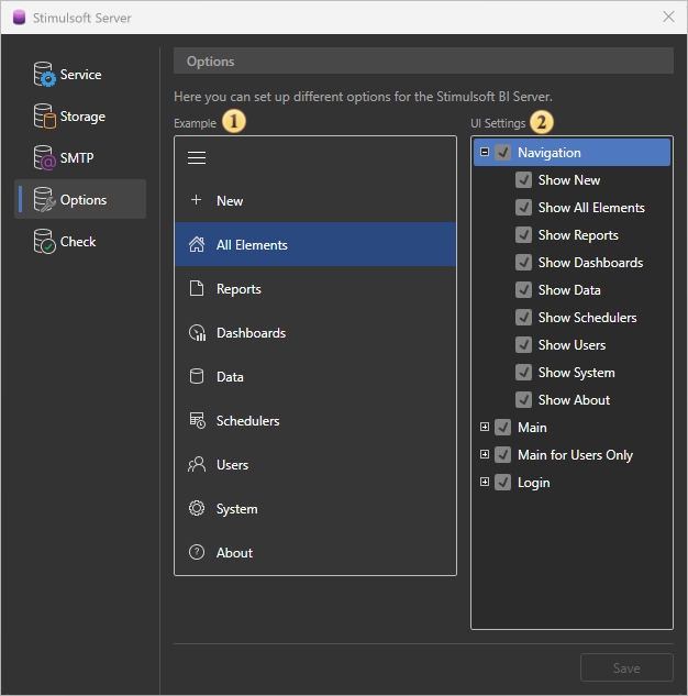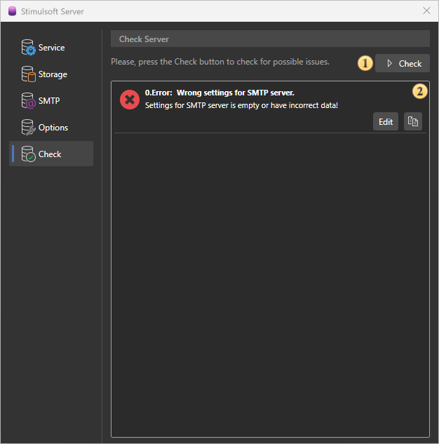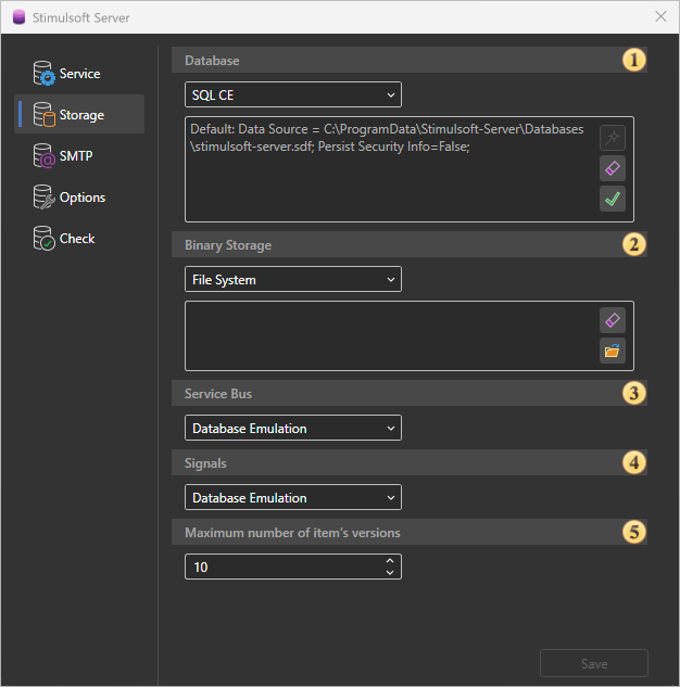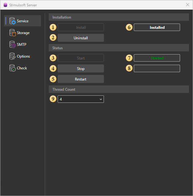 The server controller can control Stimulsoft Server. This utility is installed with the server and folded into a tray on the taskbar. With this utility, you can delete, stop, start, and restart the report server, change the database used by the server, check for server issues. All commands to control the server are separated into tabs: Service, Storage, SMTP, Check. Consider these tabs in more detail.