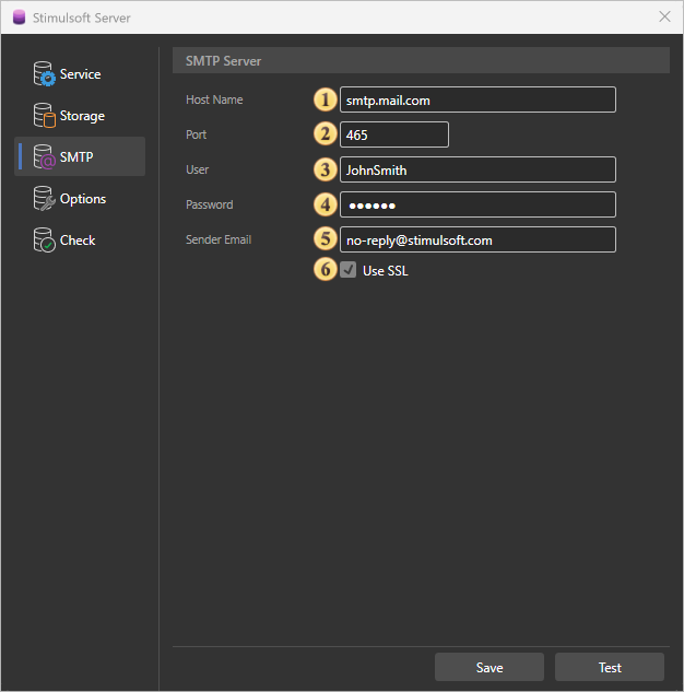 After entering the smtp server settings, you must click the Save button. Also, on this tab there is a Test button to check the smtp server settings. When clicked, a test letter will be sent to the specified address.