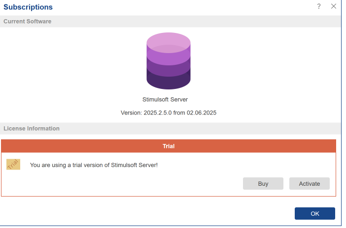 As you can see in the picture above, the version is trial. To get a licensed version of Stimulsoft Server, click Activate and enter the registration information (username and password).