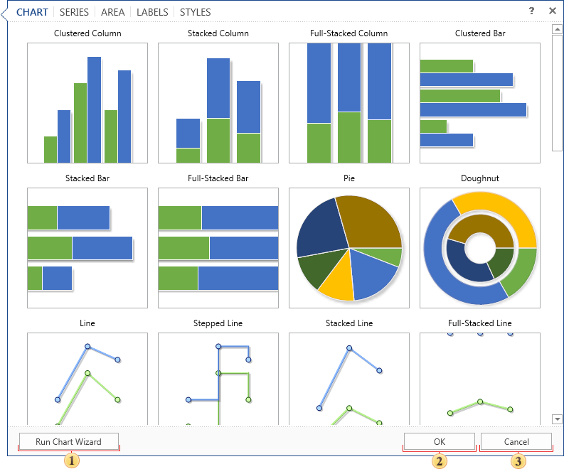 As can be seen from the picture above, the chart editor contains the following tabs: