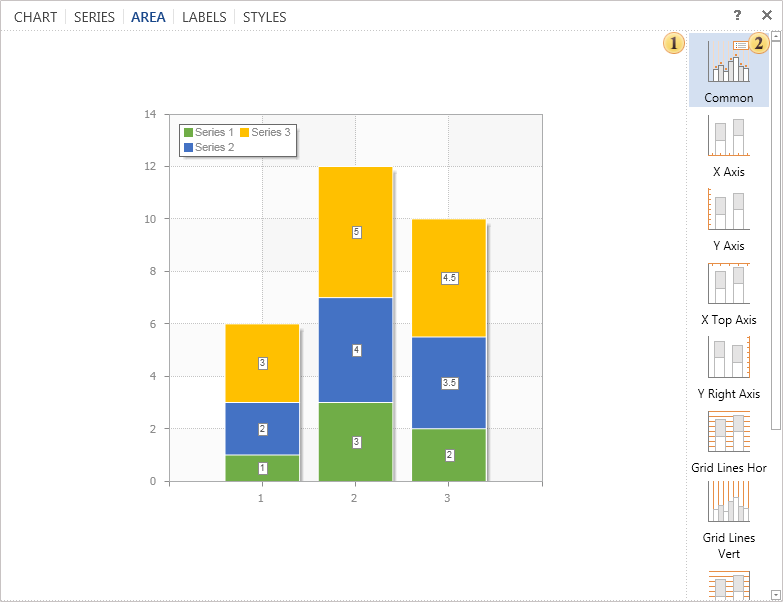 The Area is a space that includes the basic chart items: rendered data series, axes, chart title and legend. The management of this space is carried out on the tab Area, in the editor Diagram.