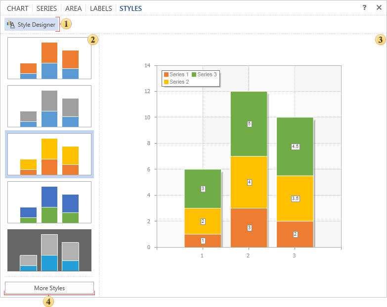 You can completely change the design of charts, ranging from basic colors and ending with shadows, borders, and so on. You can do this in the tab Styles.