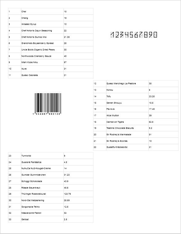 When rendering a report, a list of products will be displayed in the component Panel1. After the panel is filled the list of products will be output in Clone1, and then in Clone2. If not all data from the source will be displayed in the report, the rendering continues on the next report page, in the same sequence (Panel1 - Clone1 - Clone2). At the same time, the ZIP code and bar-code will be output. The picture below shows a page of the rendered report.