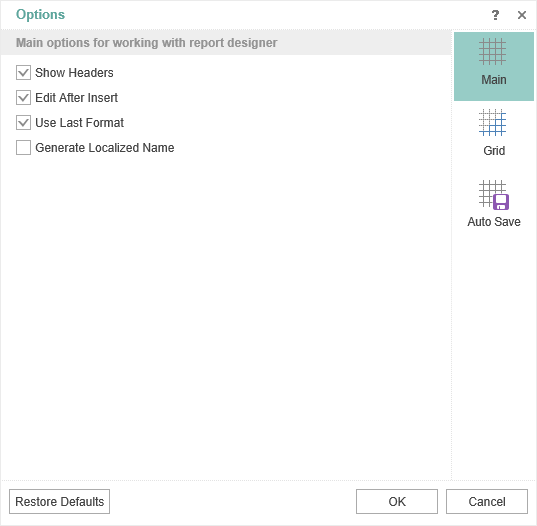 In the Options menu you can find advanced settings of the report designer. These settings are located on the following tabs: