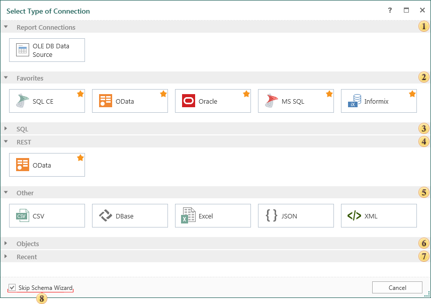 The Skip Schema Wizard parameter. When you are creating a data source you can retrieve data from the storage in the following ways: