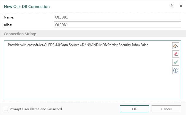 You should indicate the name of the connection, its alias, as well as the connection string. Here are the buttons to call the query builder, clear the connection, check the connection and the connection string template button (for OLE DB templates is as follows - Provider=SQLOLEDB.1; Integrated Security=SSPI; Persist Security Info=False; Initial Catalog=myDataBase; Data Source=myServerAddress). To verify the connection string, press the Test button. However, if the connection string does not contain errors, the user will be shown a window with the Connection was successful. If the connection string contains an error, the user will be shown a window with the text of the error that the database server returned in response to the attempt to create the connection.