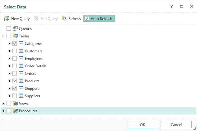 After clicking Ok, a new connection will be created and you will see a form of retrieving data. Depending on the type of connection and on the value of the Skip Schema Wizard parameter, the form of retrieving data will be open. In our example, the flag of the Skip Schema Wizard was unchecked. Then data retrieval is carried out by the scheme. To get a list of tables from the database, it is necessary to click the Refresh button in this window. You can also enable/disable the Auto Refresh mode setting/clearing the flag. If the flag is checked, the wizard will automatically update the list of data tables. The list in this window contains tabs, which are arranged in a hierarchical form. The main tab represents a category (for example, Queries, Tables, Views, Procedures).