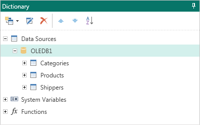 After clicking Ok, the data sources Categories, Products and Shippers will be created. The picture below shows the created data sources in the Dictionary.