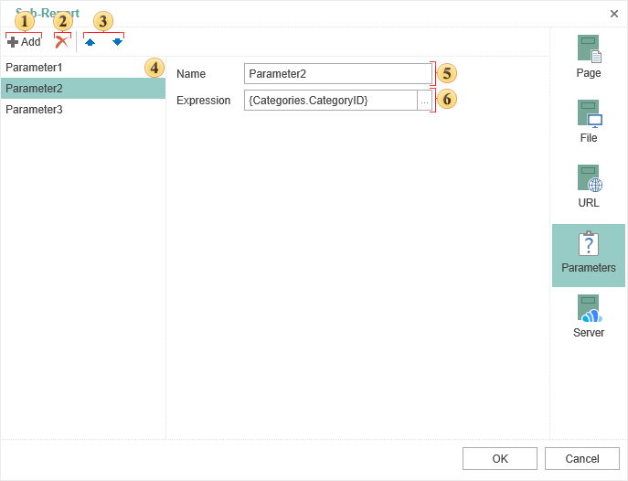 The picture below shows the editor Sub-Report on the tab Parameters.
