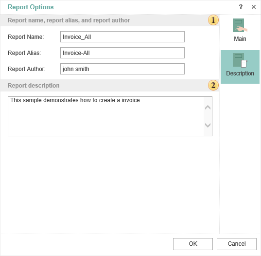 In this field you can specify the report name and its alias and report author.