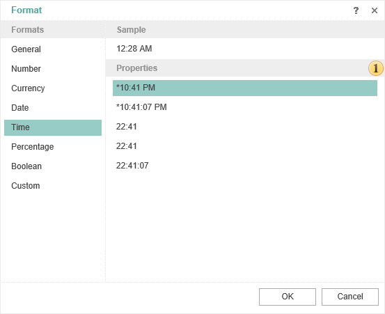 The format Time is used to show time. The format has different output options - short date format and extended date format (with seconds).