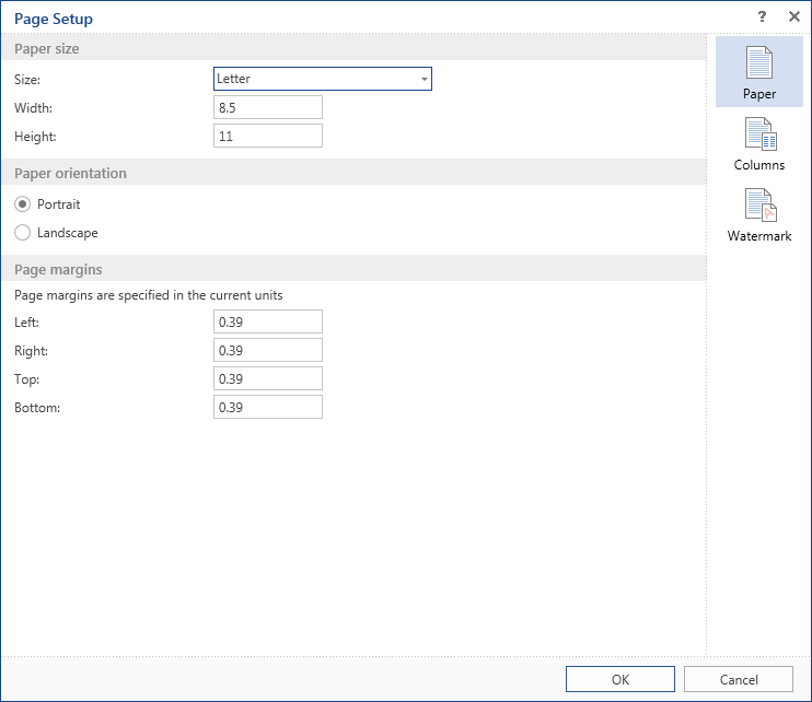 This group contains elements to control basic parameters of a page. These are page margins, orientation, page size, columns.