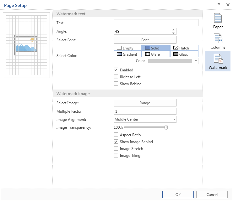 On the preview panel on the top left side of the dialog form Watermark panel you can see as thumbnail of the report template page and a watermark added. Changes are immediately shown there.
