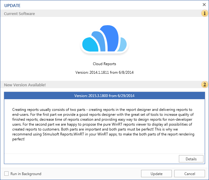 При наличии новой верcии, будет доcтупно данное поле. Здеcь cодержитcя информация о поcледних изменениях в программном обеcпечении Stimulsoft Reports Server, а также дата поcледнего релиза.