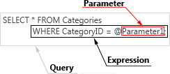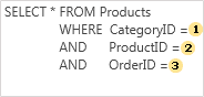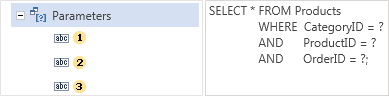 As a rule, the @ symbol is used to specify a parameter in the query. The @ symbol is used with named parameters, i.e., after the @ symbol goes the name of the parameter. But in some databases (for example, in OleDB), the @ symbol cannot be perceived by the adapter, and database queries with parameters will not work. In this case, you can use unnamed parameters. For specifying unnamed parameters in the query, the ? character is used. After the ? symbol, the parameter name is not specified. In this case, the order of parameters in the Parameters tab is essential. As indications of the ? characters in the query, settings will be taken sequentially from the Parameters tab in the top-down direction. Consider the following example. Suppose three parameters are specified in the query.