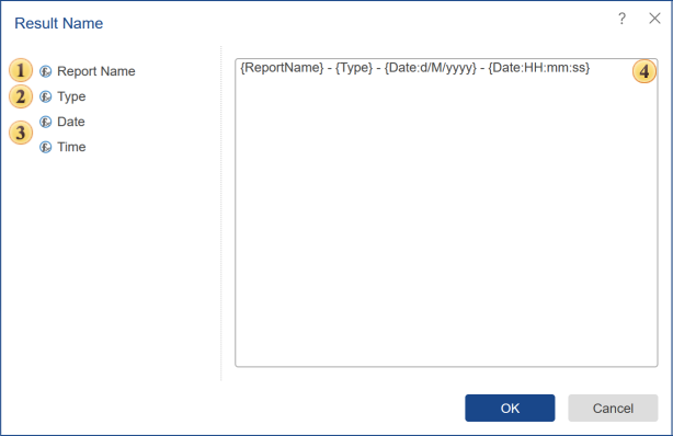 By default, when you convert (export) the report, the result name is generated automatically. It will consist of the report name before the conversion date plus the conversion date-time. For example, there is the .mrt report, “Report1”. Let’s convert the report to PDF document using the command Run. This will create a PDF document with the name Report1-10/4/2020 2:26:55 PM, where 10/4/2020 2:26:55 PM is the start time (conversion) of the report. Sometimes it is necessary to set a mask (template). This can be done in the window Result Name.