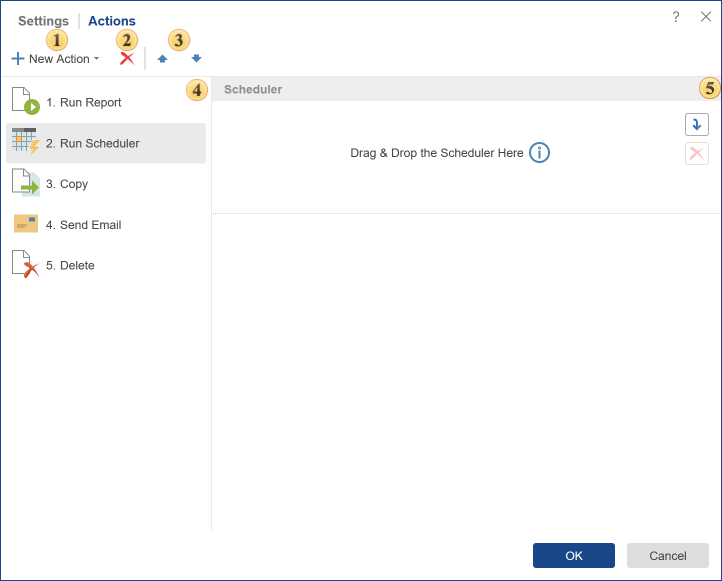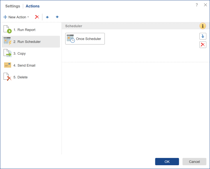 The panel list of actions. This panel displays the added action, those that will be executed each time you run the Scheduler.