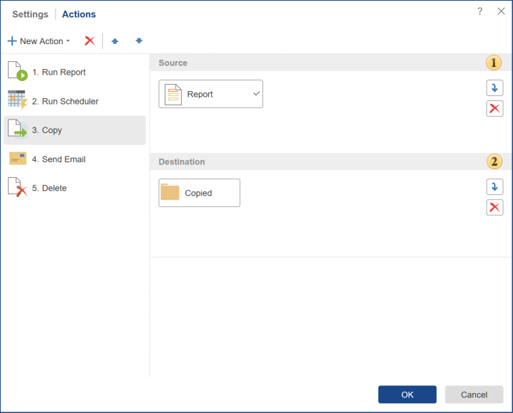 Similar types of objects in the fields Source and Destination. It is impossible to copy Report to File, or vice versa.