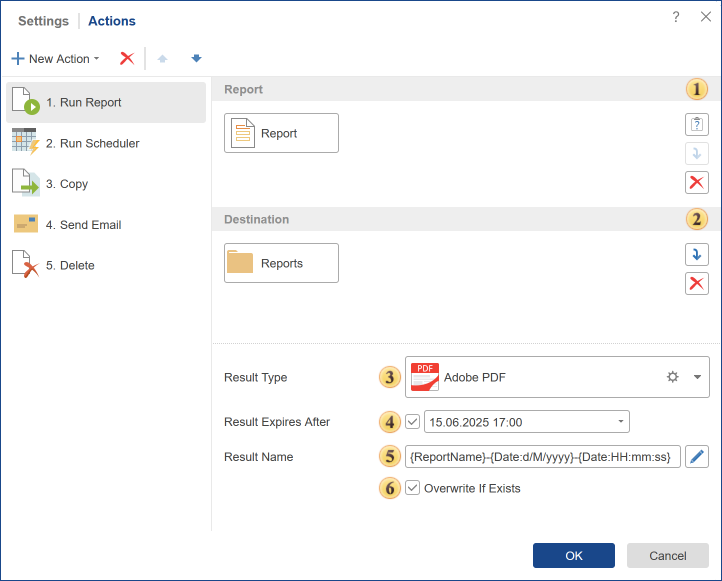 The Overwrite If Exists parameter provides an opportunity to rewrite the result. If this option is disabled, then each time you perform this action, the result will be represented as a separate item, if the report is converted once an hour, then a new item in the tree will appear every hour or sent according to the list of contacts. In this case, the names of these items may be similar. If this option is enabled, and the names are identical, then each new result is overwritten instead of the previous one.