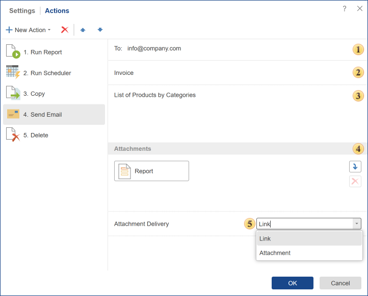 If you specify a contact list item as the destination, it will be necessary to determine the method of attaching the report to an email. The report can be directly attached to the email as a file, or a link to this report will be attached.