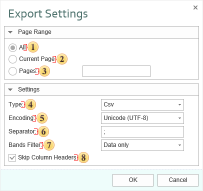 The option Data Only enables/disables the mode of exporting data only. If this option is enabled, information will be exported from the Data bands (the component table, Hierarchical band). Only these bands are processed, the rest are ignored. If this option is disabled, the entire report will be exported;