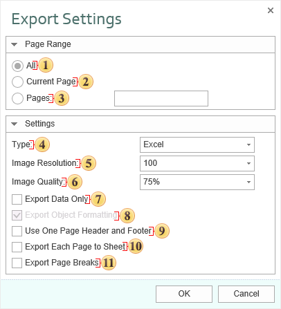 The checkbox Export Page Breaks is used to display the borders of the report pages on the Excel sheet. In other words, if the report contains 10 pages, all of them are placed on one sheet after export. Enable this option to define the borders of pages. If this option is disabled, all report pages will be printed, and, if no other delimiters present, will be output in one sizeless page.